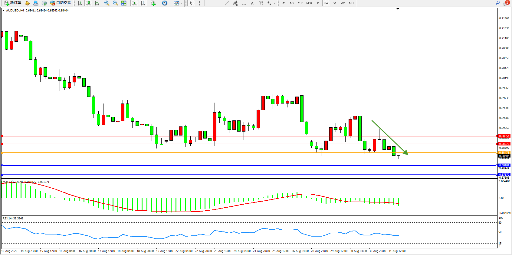 交易策略:0.68479下方看跌,目标0.68181、0.67970
