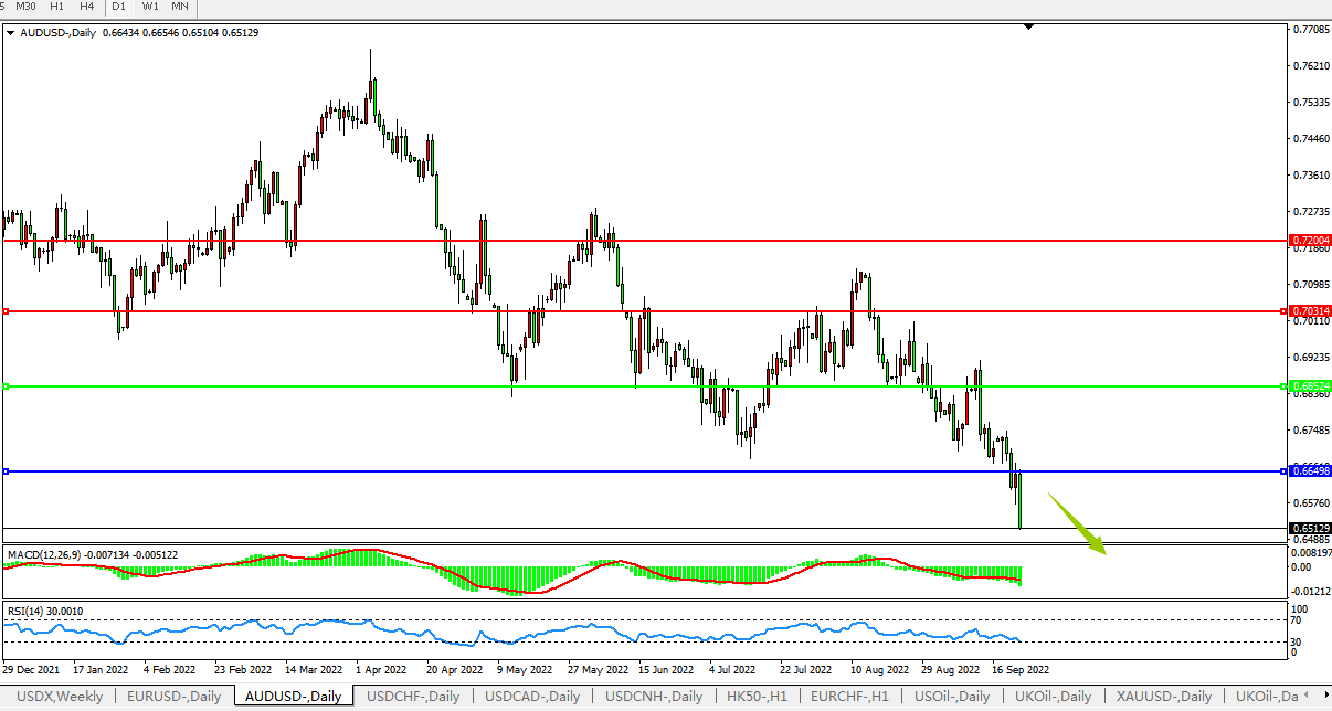 日线图看:短期汇价开始加速下行,MACD运行于0轴下方且量能放量,RSI继续走低,预计汇价大概率将在反弹后进一步下行。