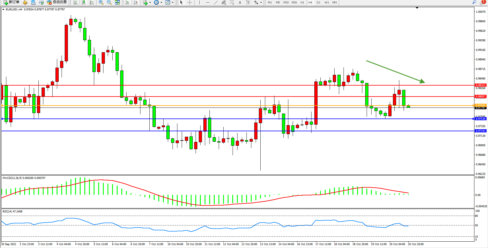 交易策略:0.97845下方看跌,目标0.97530、0.97243