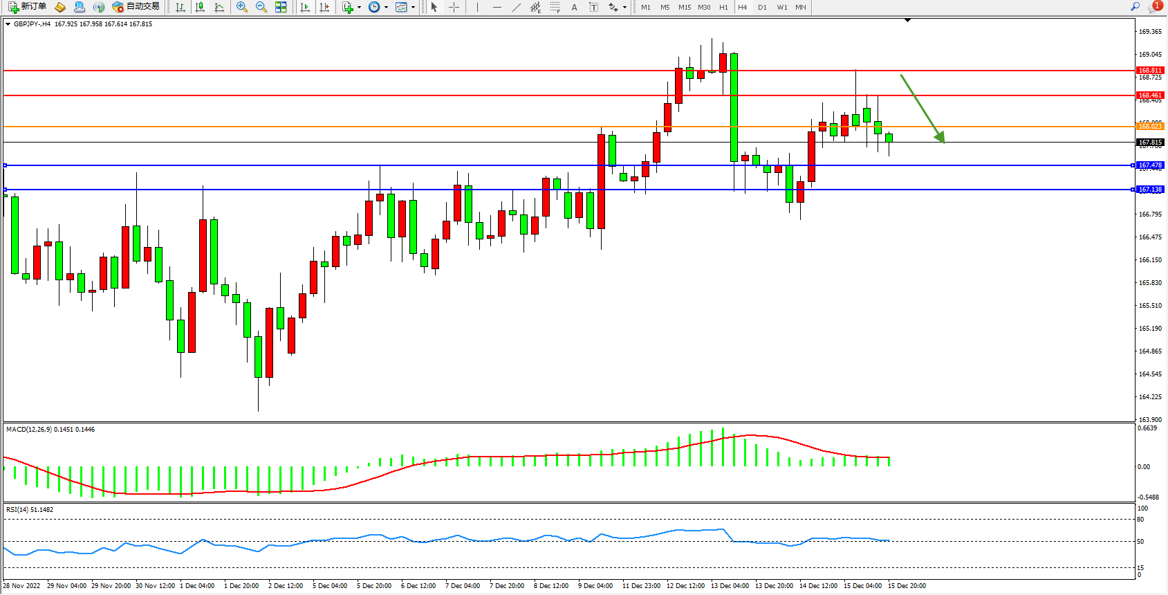 备选策略:168.023上方看涨,目标168.461、168.811