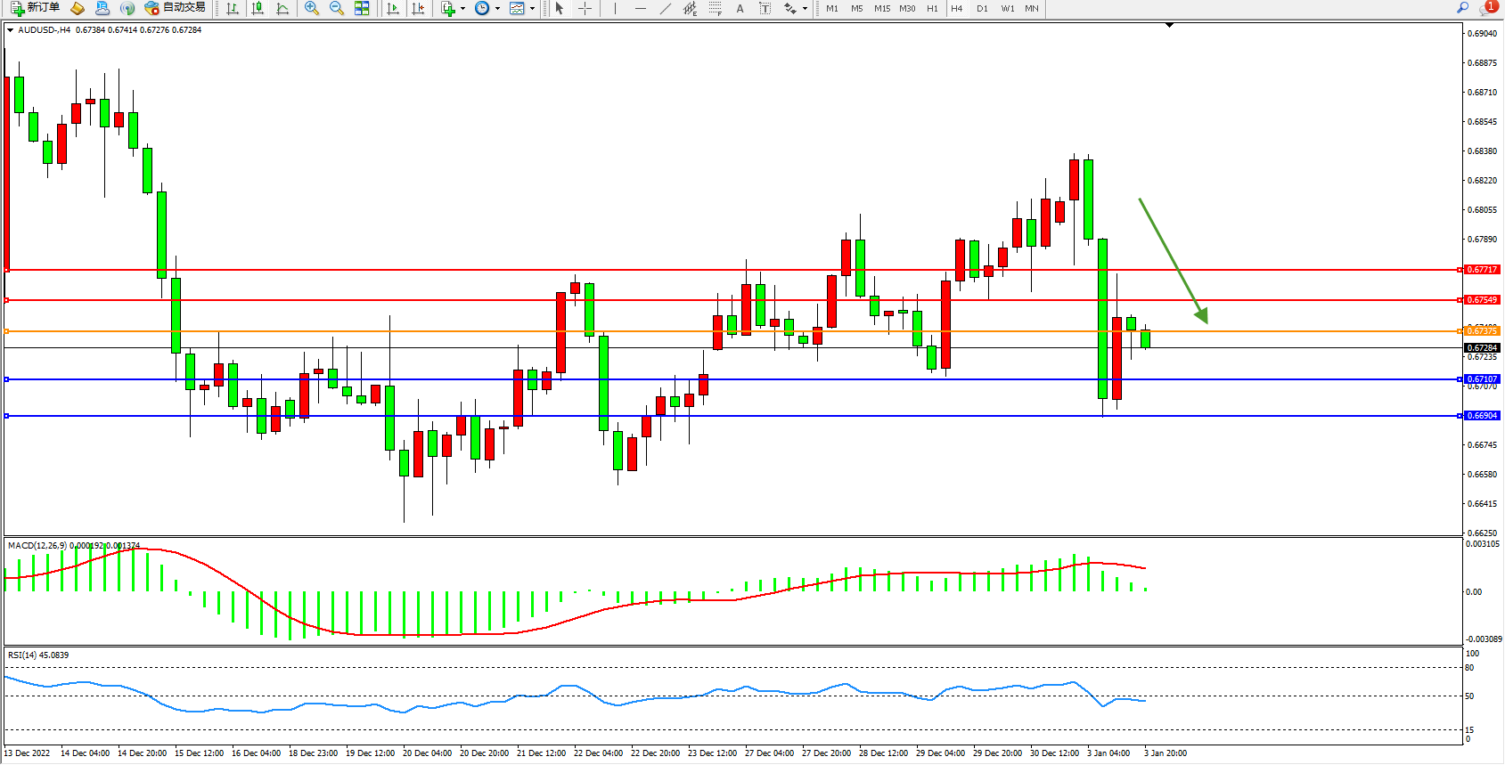 交易策略:0.67375下方看跌,目标0.67107、0.66904