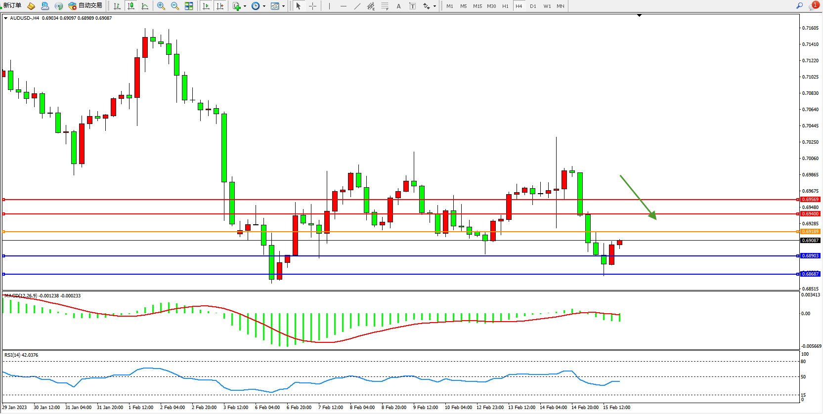 交易策略:0.69189下方看跌,目标0.68903、0.68687
