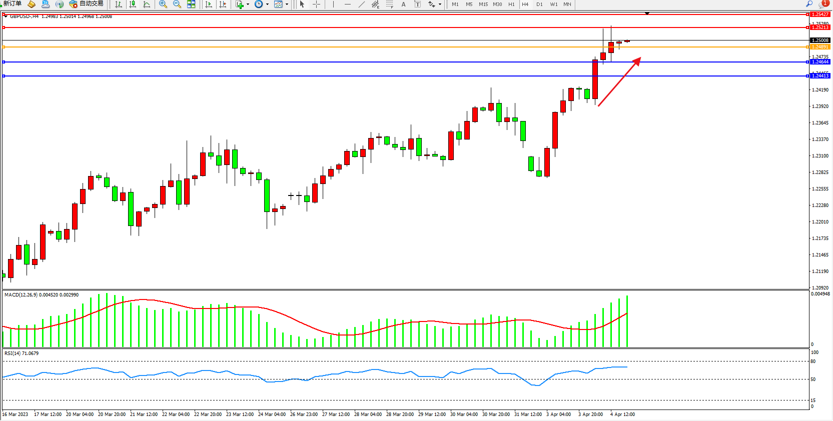 4小时图看:多头动力高位上扬,市场看涨情绪笼罩,短期有继续攀升态势,MACD指标处于多头区域不断拉升,RSI指标处于多头区域高位徘徊;