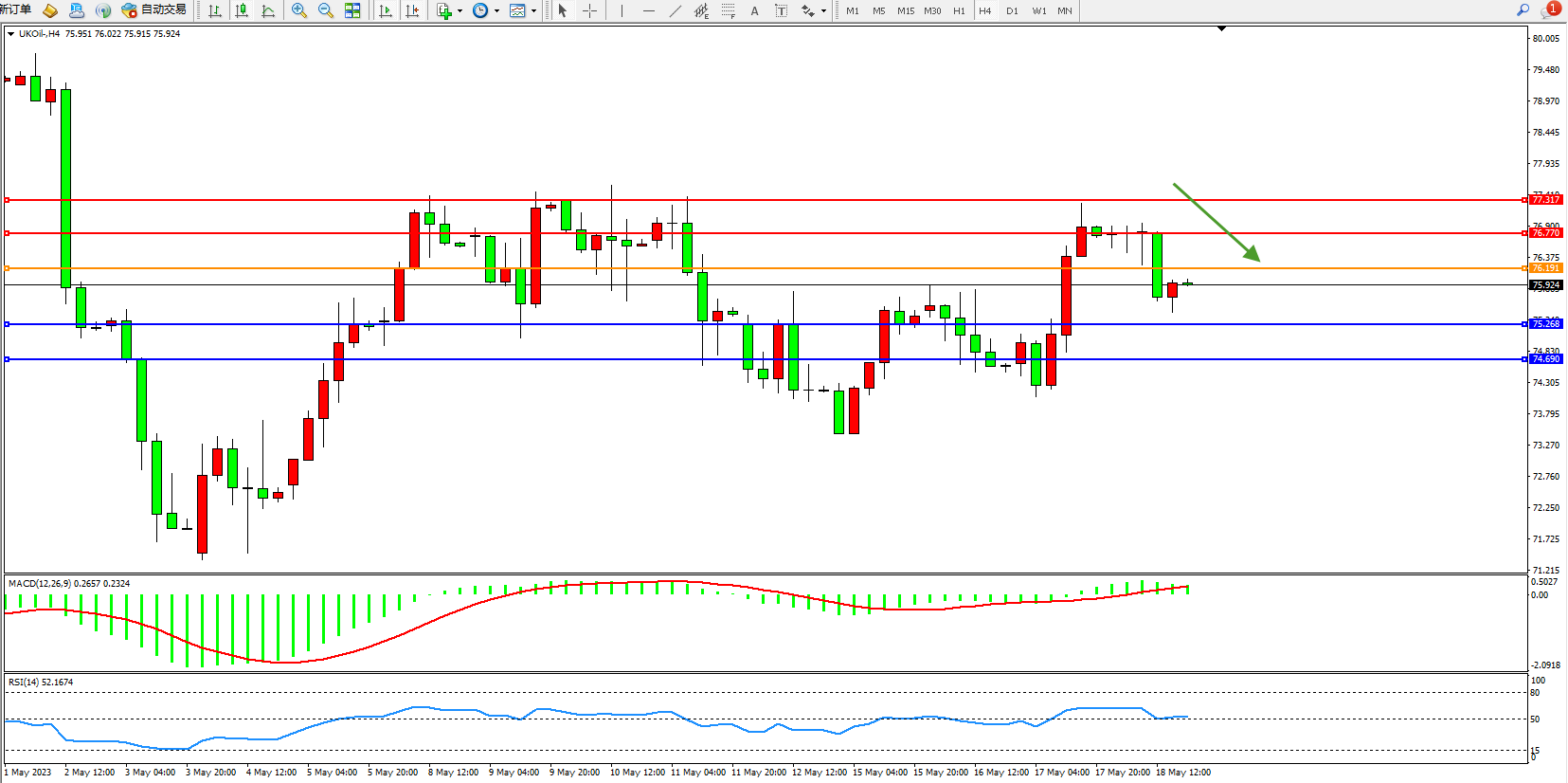 交易策略:76.191下方看跌,目标75.268  74.690