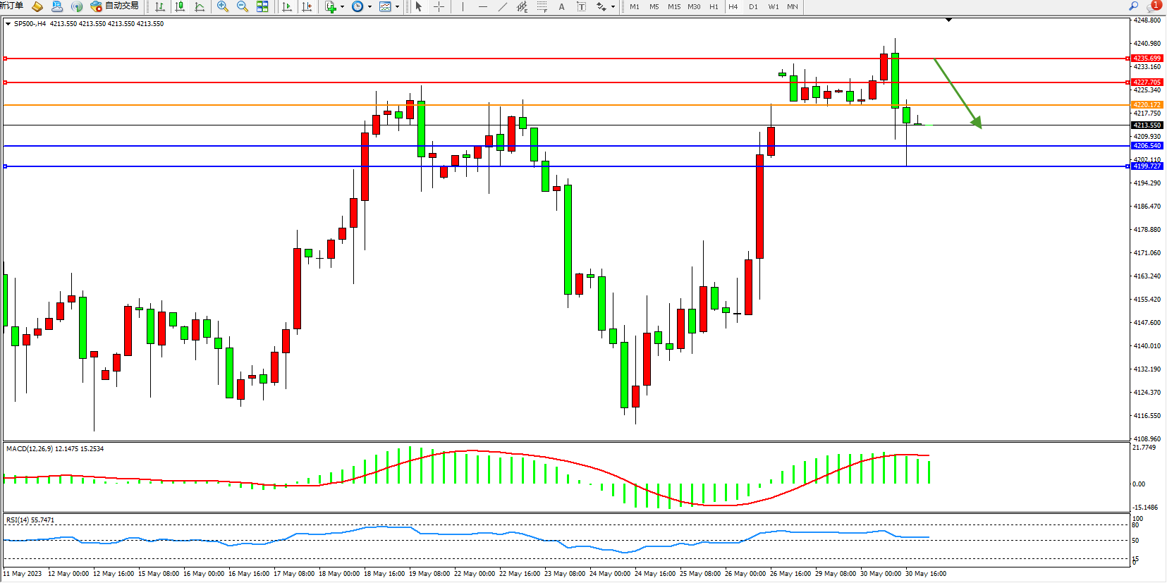 标普SP500——4小时K线图显示: