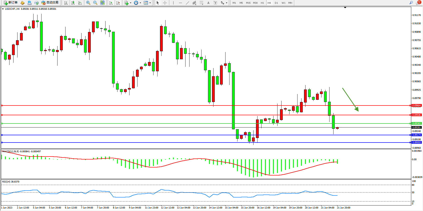 美元瑞郎USDCHF——4小时K线图显示: