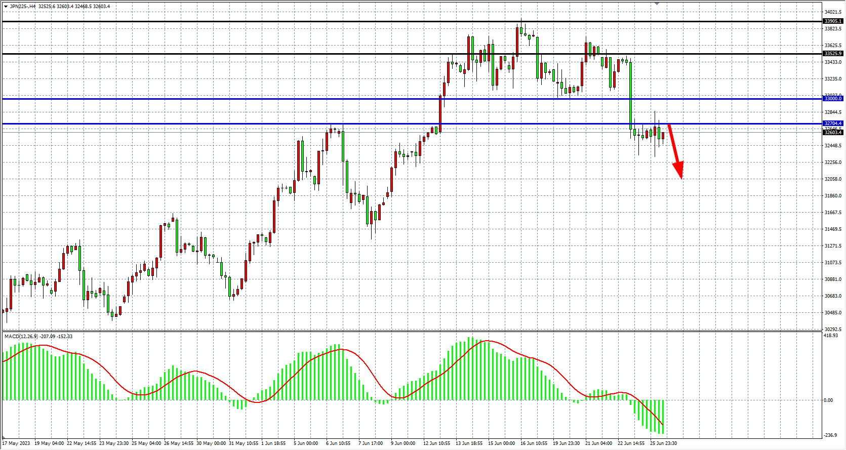 交易策略:32700 下方看跌,目标32200  31800