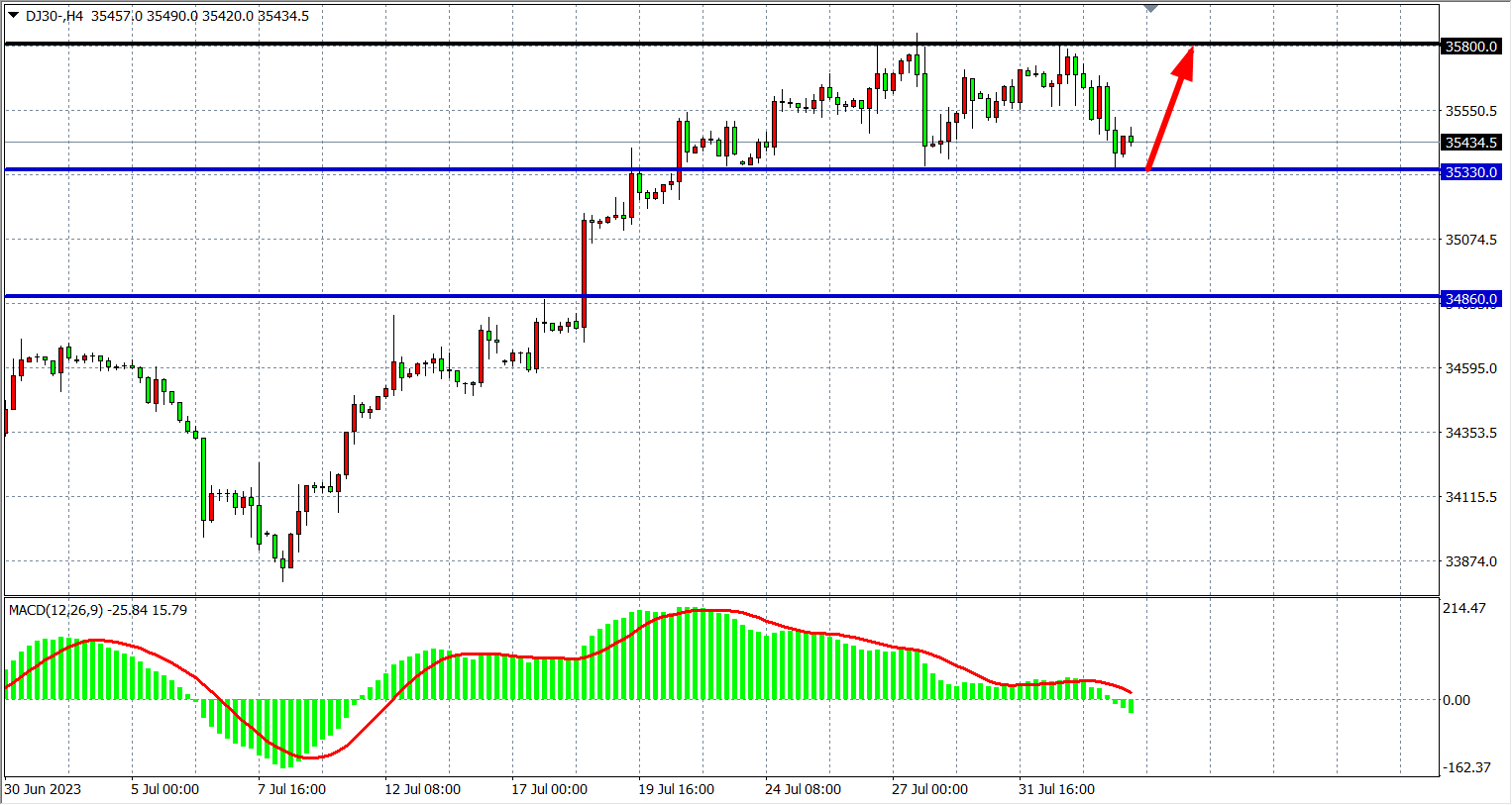 交易策略:35330 上方看涨,目标 35800 36300
