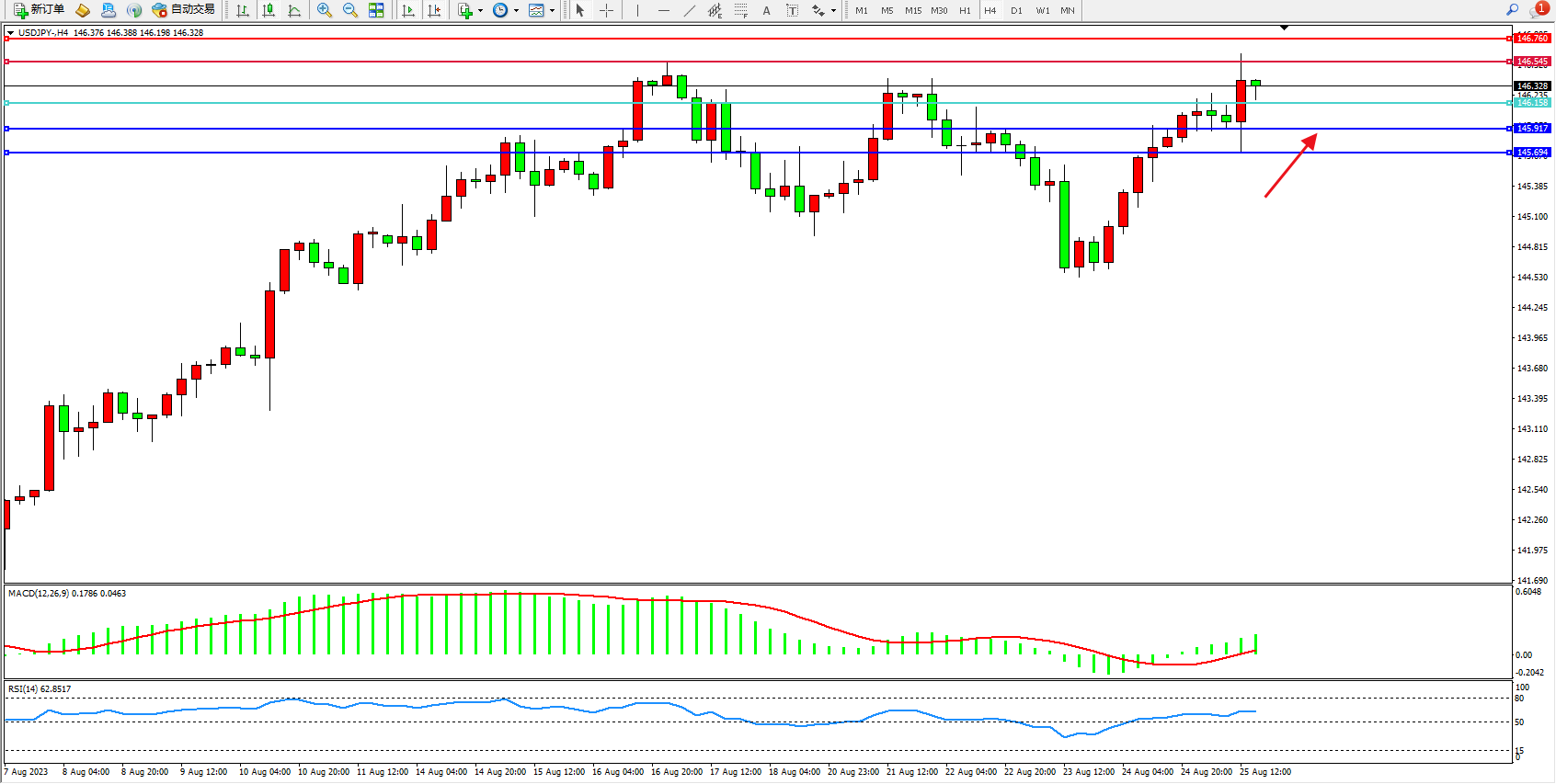 交易策略:146.328上方看涨,目标146.545 146.760