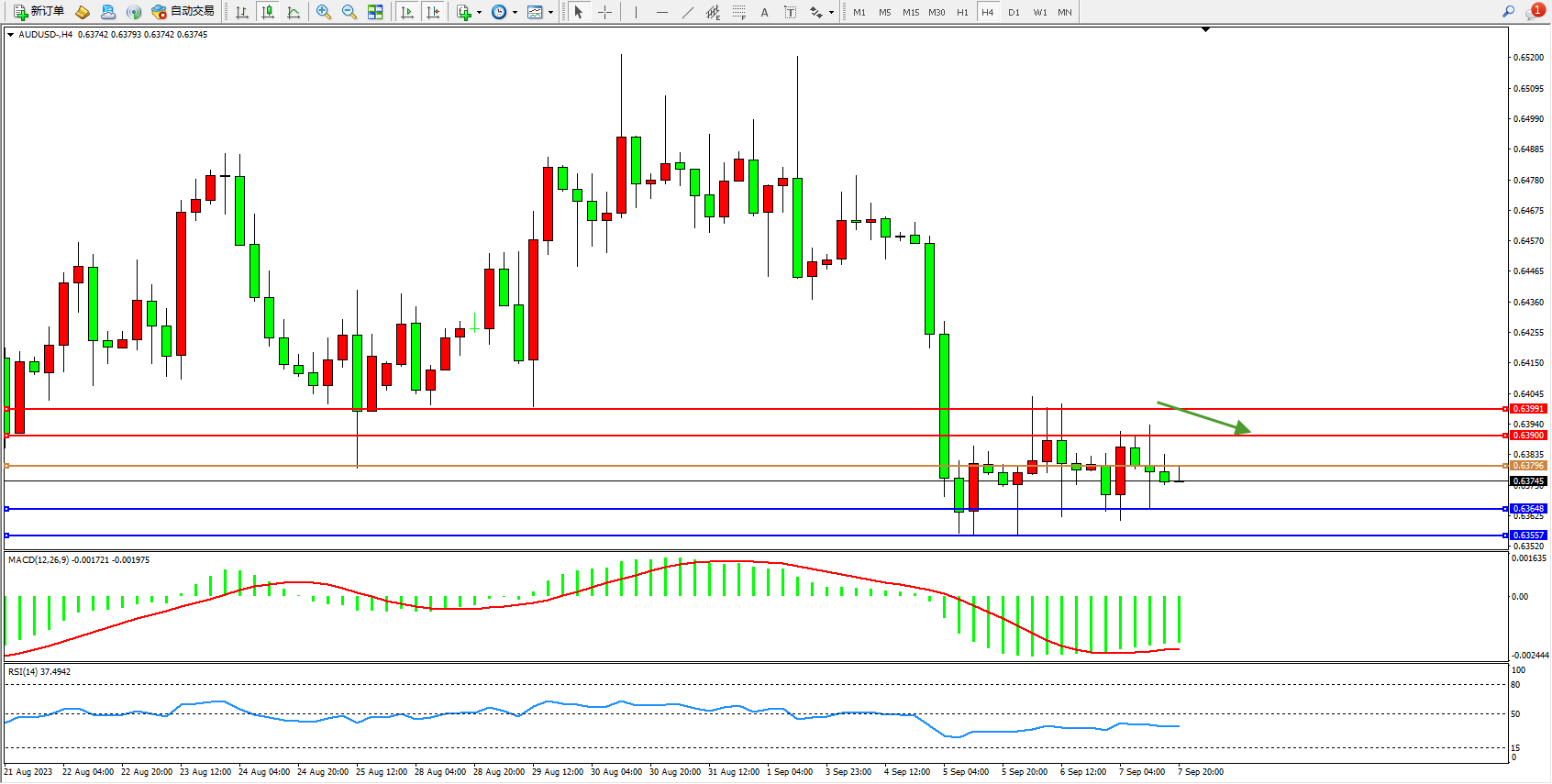 交易策略:0.63796下方看跌,目标0.63648  0.63557