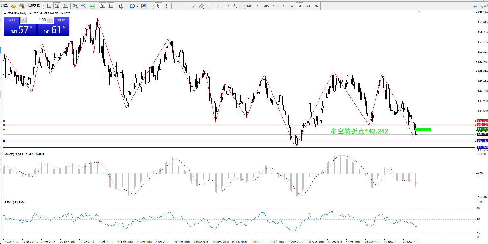 备选策略:142.242下方看跌,目标140.763、139.920