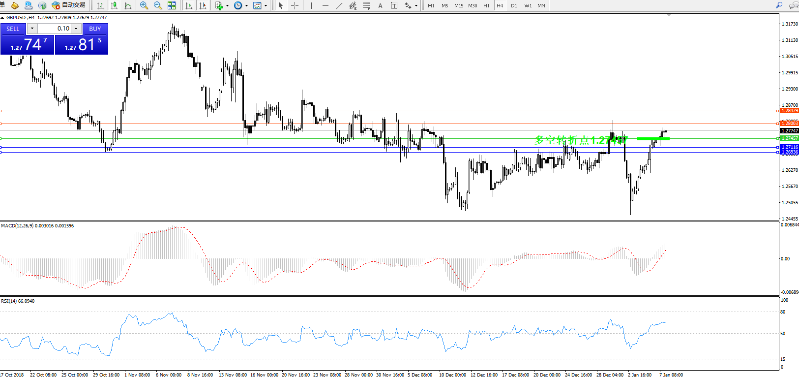 交易策略:1.27457上方看涨,目标1.28003、1.28479