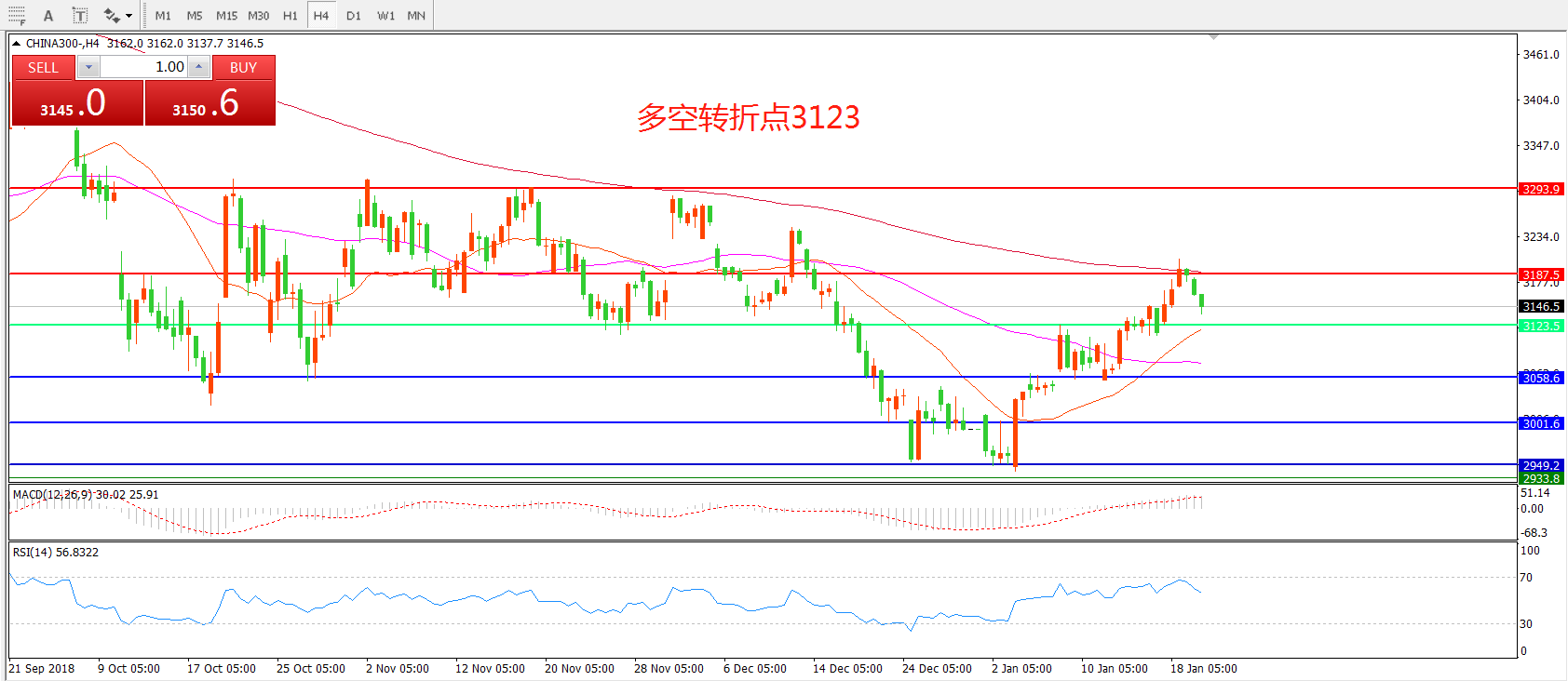 4小时图看,CHINA300中华指数站稳3058后陷入整理,冲击3187.5一线阻力如期回落, MACD红柱增加,短期反弹仍有可能。