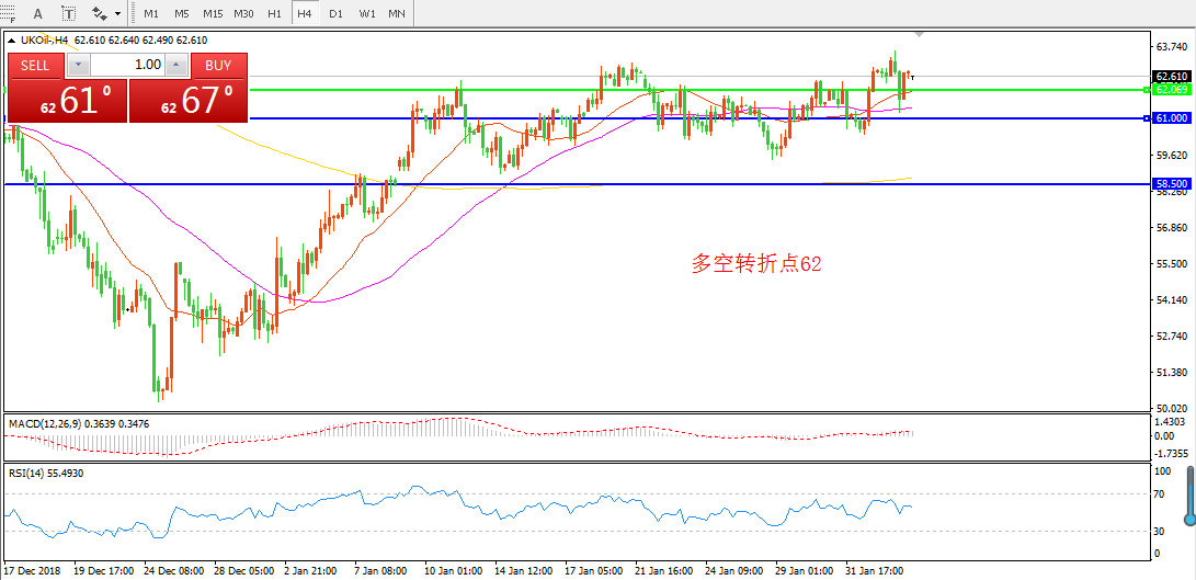 4小时图看,油价强势突破63美金后震荡回落,但整体价格依然处于均线支撑之上, MACD红柱缩减,短期内依然维持多头思路。