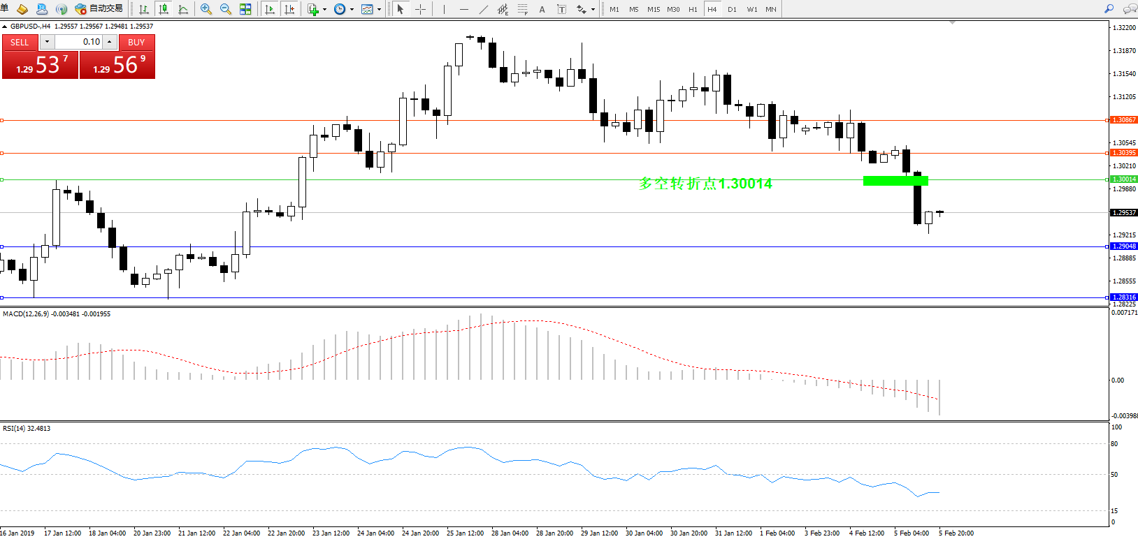 交易策略:1.30014下方看跌,目标1.29048、1.28316