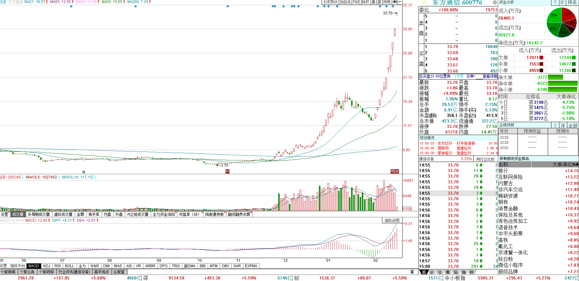 根据Wind数据统计,自猪年以来的10个交易日中,每日的涨停个股数明显增多,目前已有3只股票走出翻倍行情,分别是东方通信、国风塑业、风范股份,涨幅为145.12%、141.86%、101.25%。乘着5G东风,东方通信被资金轮番追捧,10天9个板,股价大涨145.12%,4个月涨幅超6倍,成为今年的“妖王”。