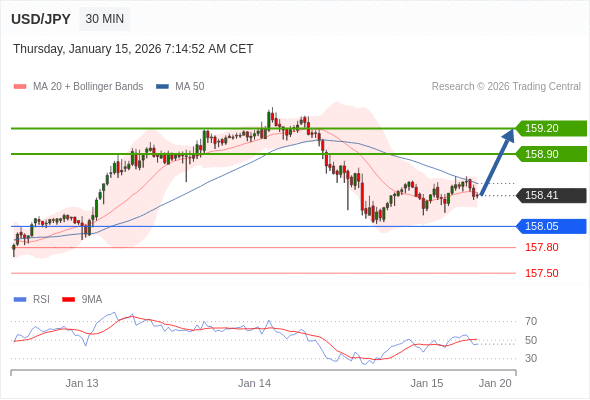 在 158.05 之上,看涨,目标价位为 158.90 ,然后为 159.20 。