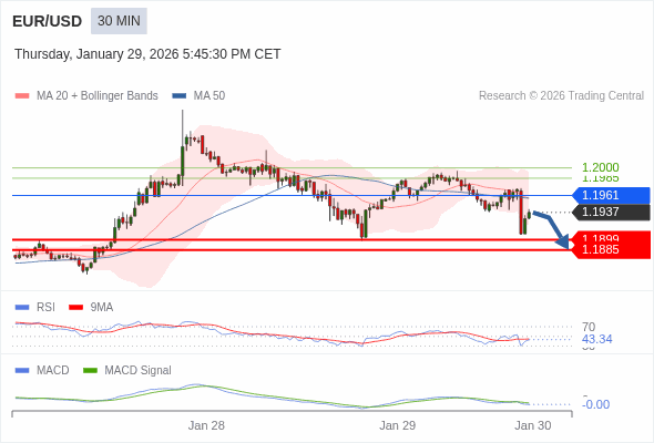 欧元/美元 当日内 : 看跌,在 1.1961 之下。