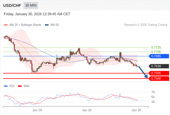 在 0.7685 之下,看跌,目标价位为 0.7605 ,然后为 0.7580 。