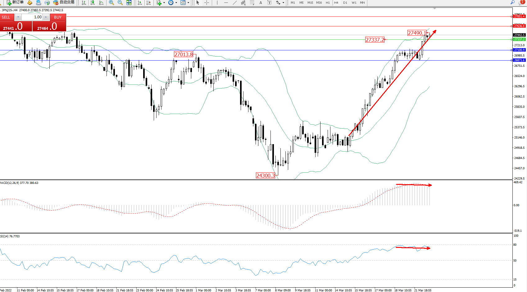 技术点评:多头动力延续布林带指标通道中上轨区间持续震荡上扬,高位抵达27490位置节点后开始整理,短期多头拉升走势或将持续,布林带指标呈上行趋势走势不断上移中,MACD指标处于多头区域维持整理平移,RSI指标处于多头区域超买区80均衡线下侧弱势徘徊中;