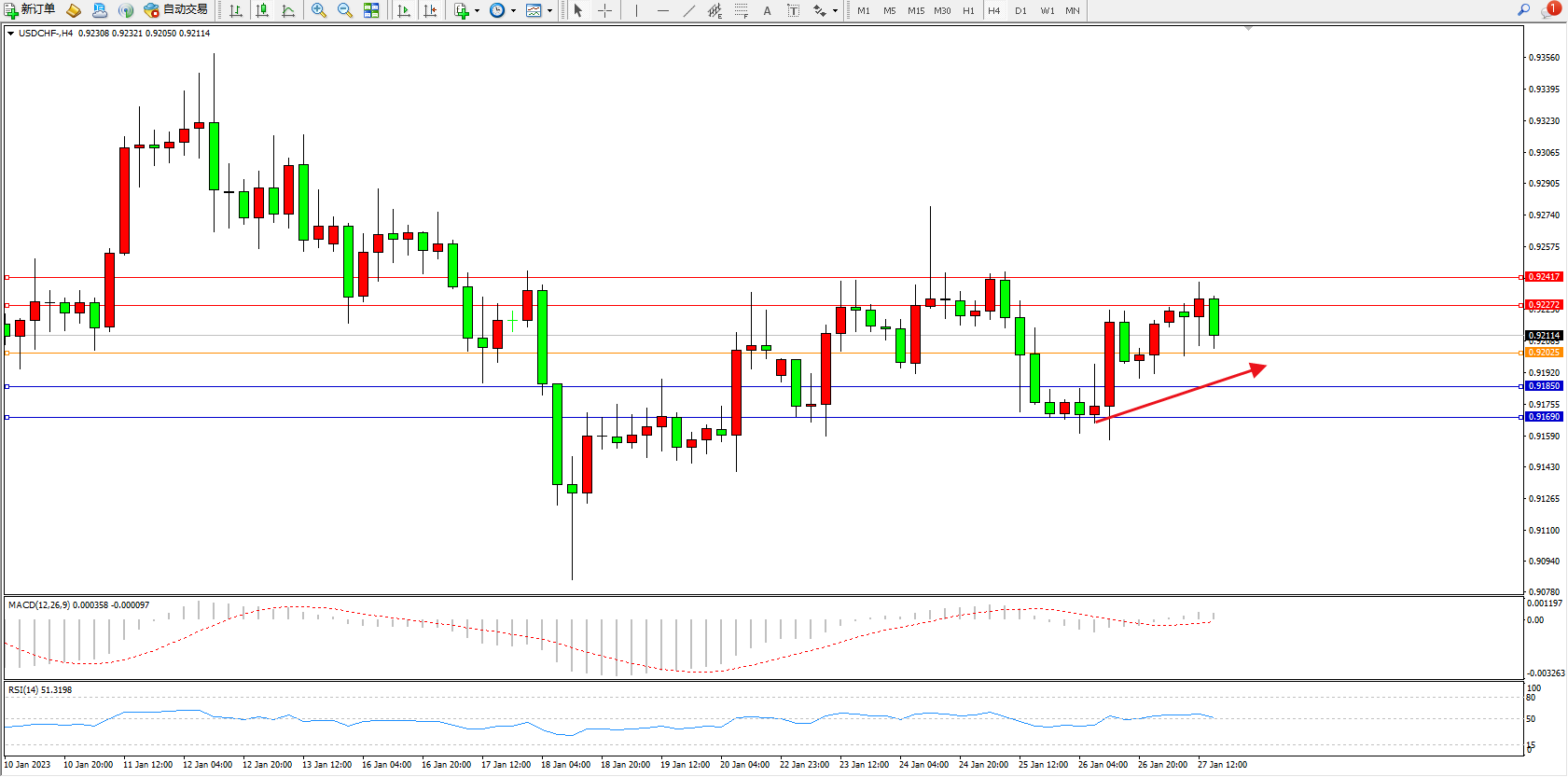 美元瑞郎USDCHF——4小时K线图显示: