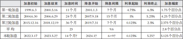 第一轮周期为1999年6月至2000年5月。20世纪90年代中后期,美国互联网科技迅猛发展,推动了美国经济的高速增长,但经济繁荣之后迎来经济泡沫,美联储重启加息将联邦基准利率由4.75%升至6.5%。